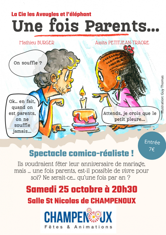 Champenoux Fêtes et Animations et la Cie les Aveugles et l'éléphant vous proposent une soirée théâtre avec cette pièce "UNE FOIS PARENTS", de Mathieu BURGER